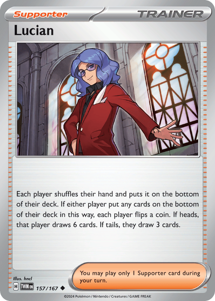 hncl is credited on Pokémon Trading Card Game artwork from 2019 through 2025. In this dataset, the largest share appears in the Scarlet & Violet series, with additional credits spanning sets such as Paradox Rift and Twilight Masquerade. Across these releases, hncl also illustrates Trainer cards, expanding the range of character-driven scenes represented.